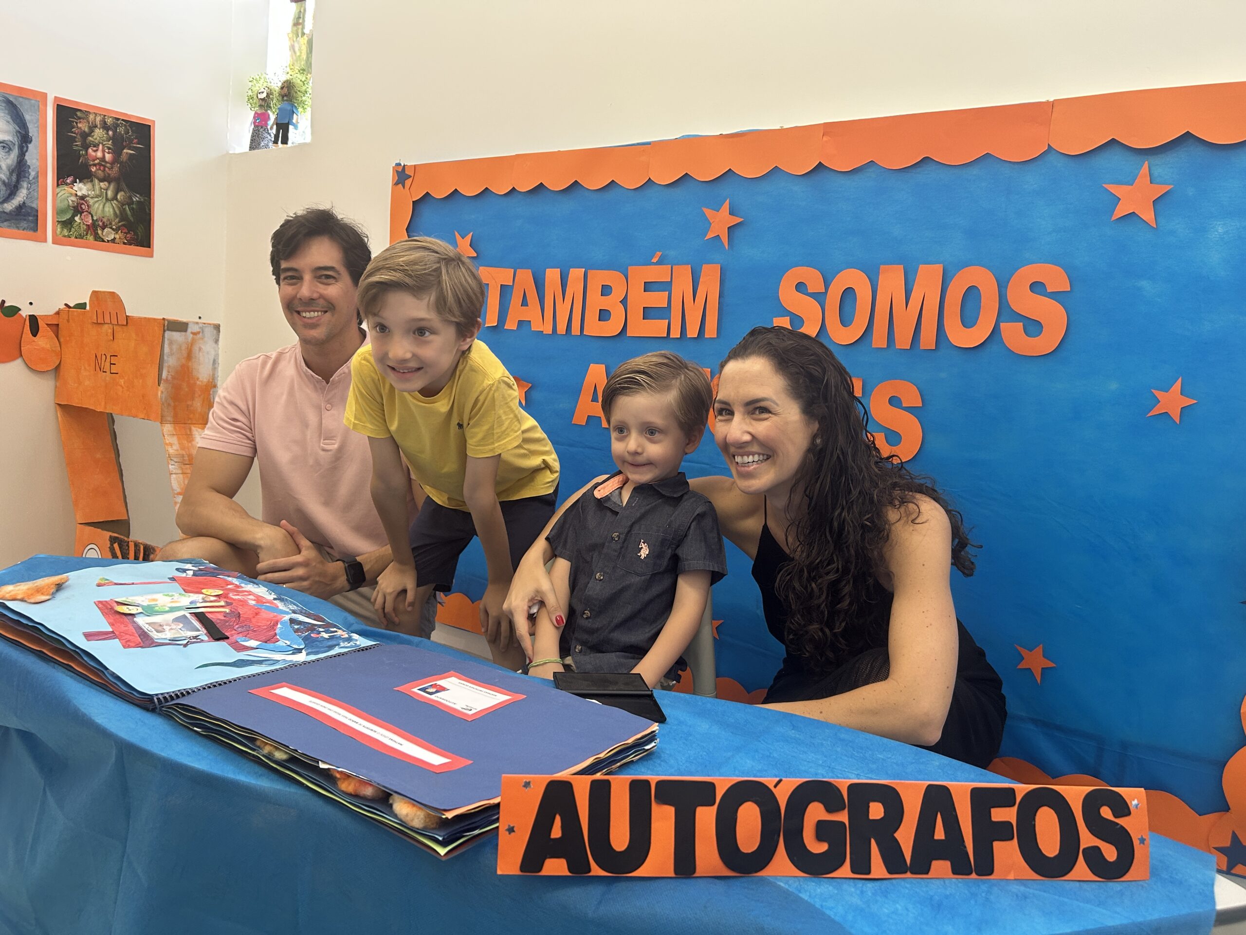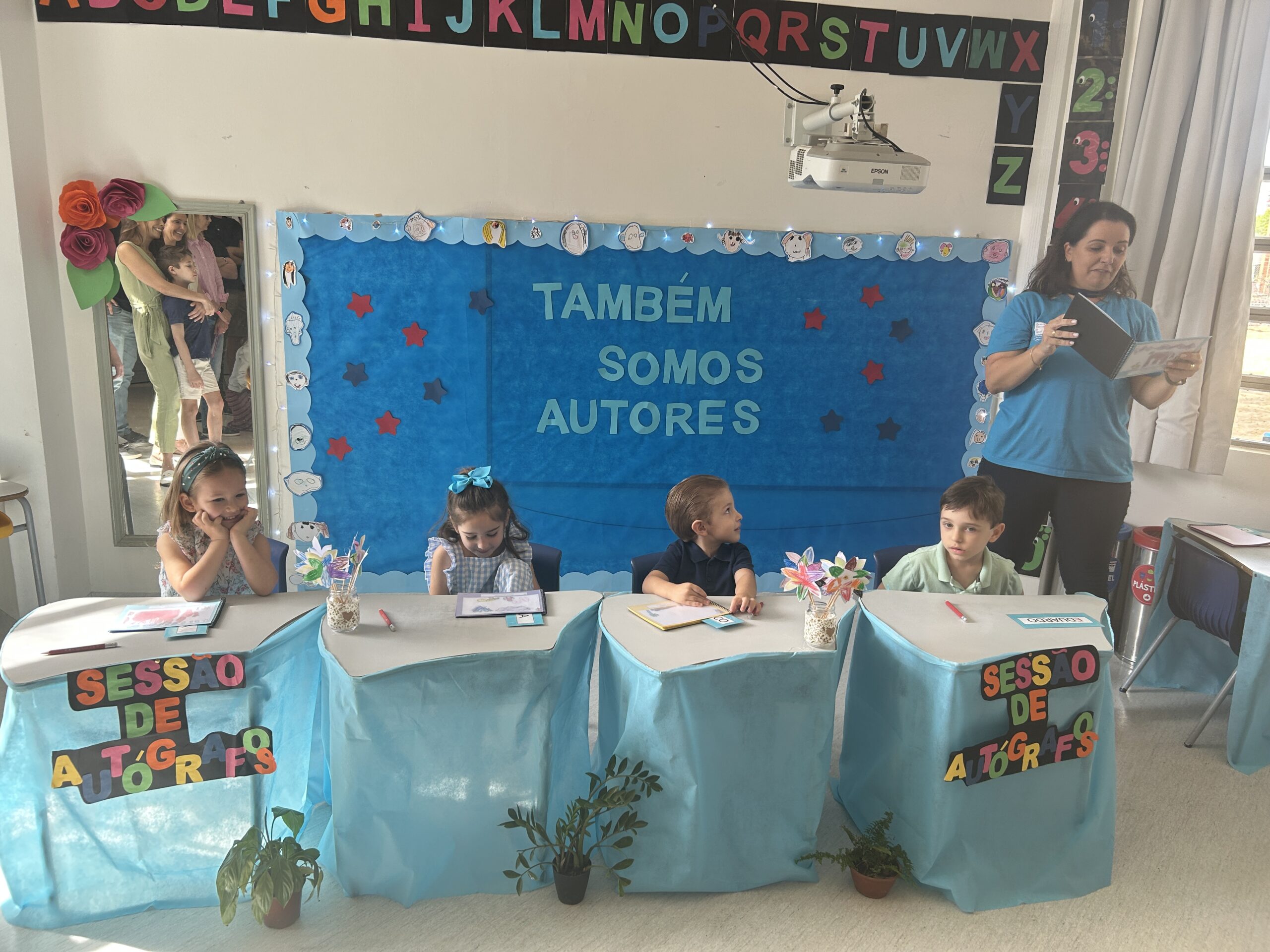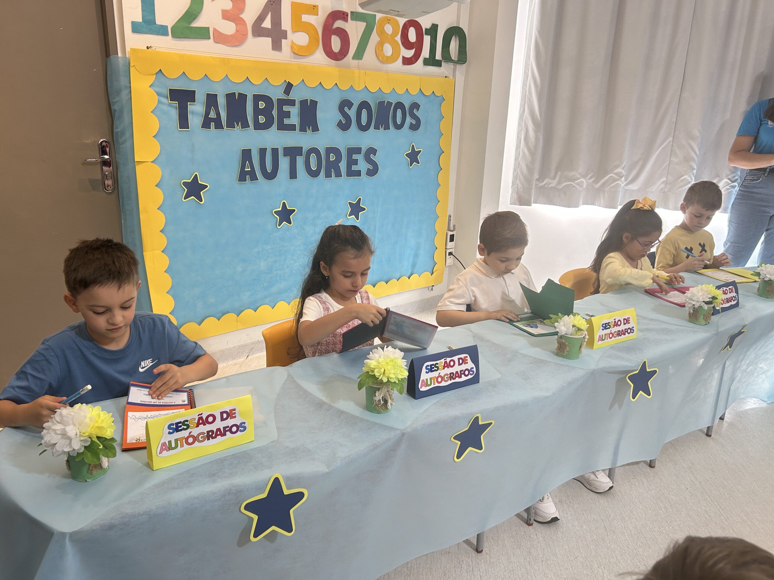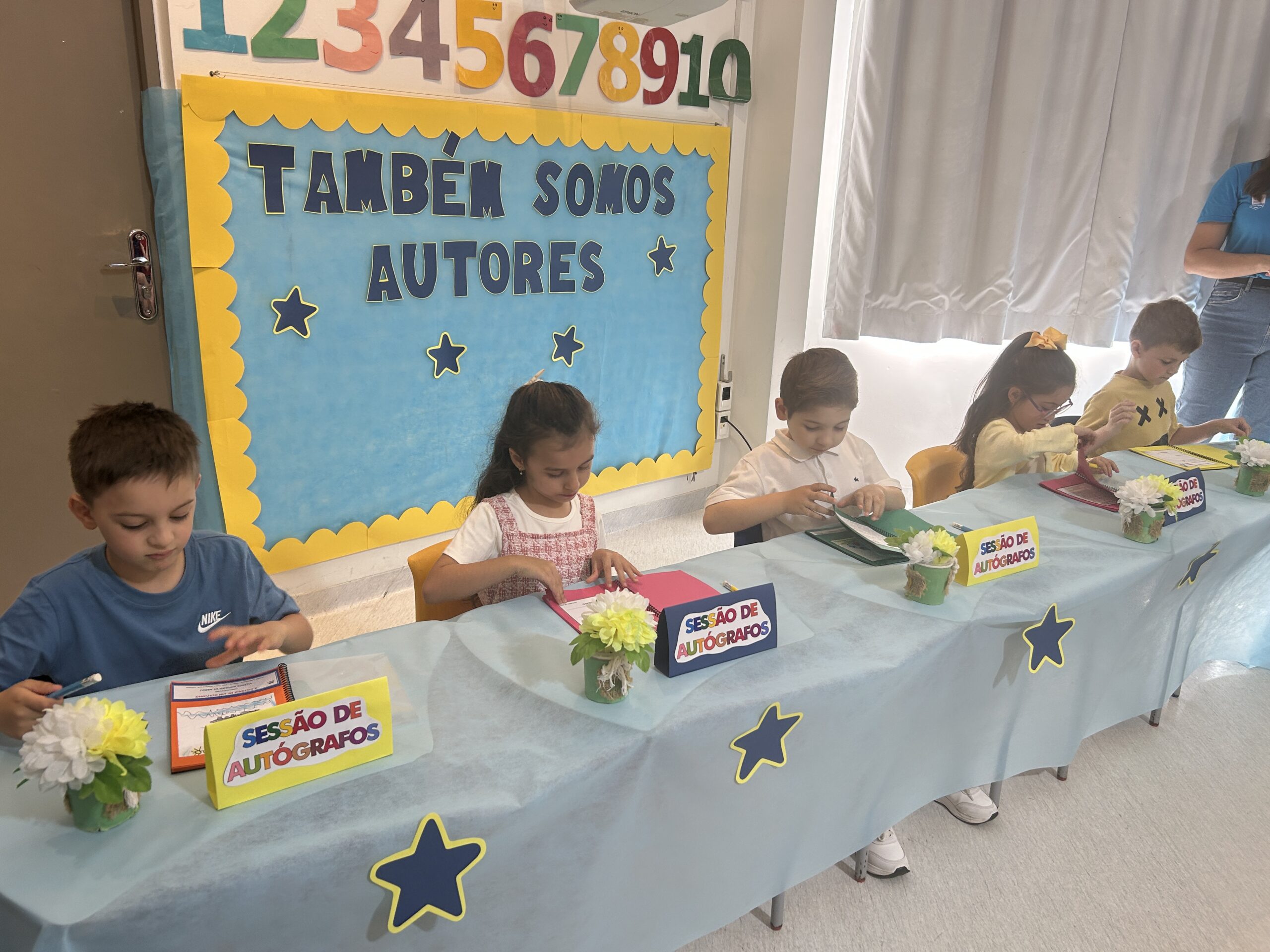 No sábado, 25 de outubro, as crianças e a equipe da Educação Infantil receberam as famílias para o evento Diálogos Criativos: Também Somos Autores e Oficina de Criação. O projeto Também Somos Autores, consiste na criação de um livro e contempla todas as turmas da Educação Infantil. Nos níveis 1, 2 e 3 a escrita é coletiva, no Nível 4, a turma é dividida em grupos, e, no Nível 5, cada criança escreve, com ajuda da professora, e ilustra o seu próprio livro. No dia do evento, os pequenos realizaram sessões de autógrafos para as famílias.