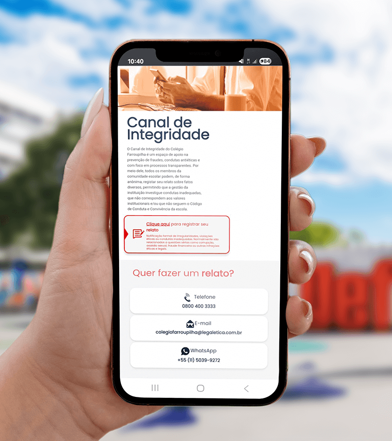 Para reforçar esse compromisso, disponibilizamos o Canal de Integridade, um espaço seguro para o relato de condutas que estejam em desacordo com o nosso Código de Conduta e Convivência. Situações como assédio moral, discriminação, uso inadequado de recursos, ameaças, entre outras, podem ser comunicadas por esse canal.